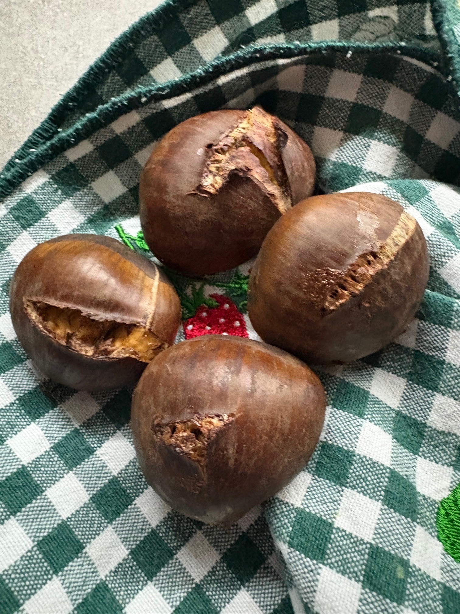 秋だねえ。エアフライアーで焼き栗。まんまるお大きいの15個くらいで2ユーロだった。安いよね✌️